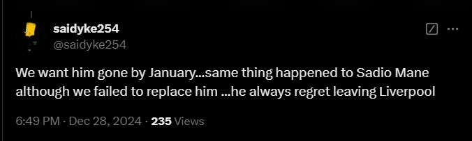 Saidyke254: «Мы хотим, чтобы он ушел до января... То же самое случилось с Садио Мане, хотя мы так и не смогли его заменить... Он всегда будет сожалеть о том, что ушел из «Ливерпуля».
