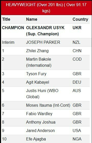 Тайсон Фьюри, который ранее занимал первое место, опустился сразу на третю позицию. Британца обогнали два боксера – китаец Чжан Чжилей (27–2–1, 22 КО) находится теперь на первой строчке, а представитель ДР Конго Мартин Баколе (21–1, 16 КО) – второй.