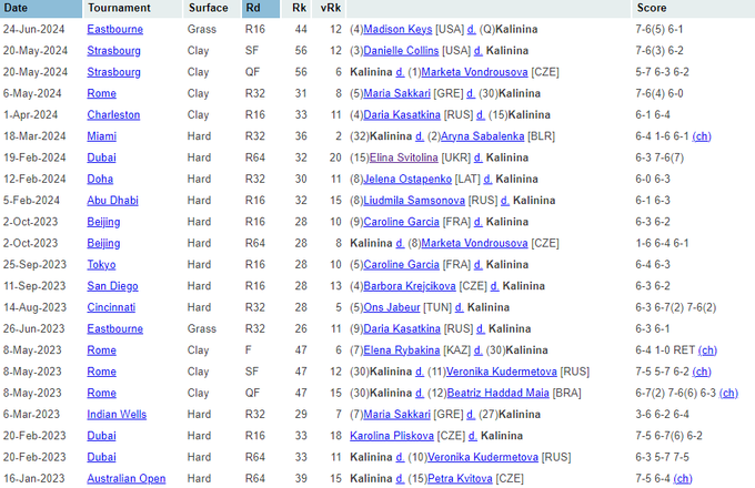 Статистика Калининой против теннисисток из топ-20 до матча против Шнайдер