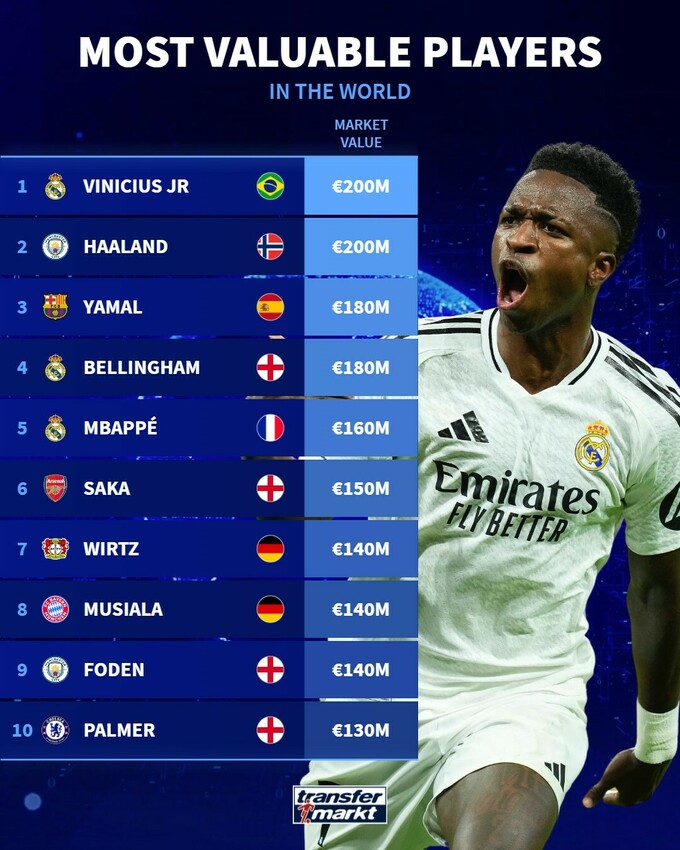 - 1–2. Винисиус Жуниор (Реал) – €200 млн
