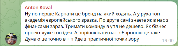 Anton Koval: «Ну во-первых «Карпаты» это бренд на который ходят. А у «Руха» топ академия европейского образца. Во-вторых сами знаете как у нас с финансами сейчас. Держать команду в УПЛ не дешево. Как бизнес проект очень топ идея. А сравнивать нас с Европой это такое. Думаю это точно в + пойдет с практической точки зрения».