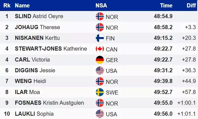 Норвежская спортсменка Астрид Слинд заняла первую строчку в гонке, обогнав ближайшую конкурентку на 3.3 секунды. Второй стала другая представительница Норвегии Тереза Йохауг. Третья – Кертту Нисканен из Финляндии.