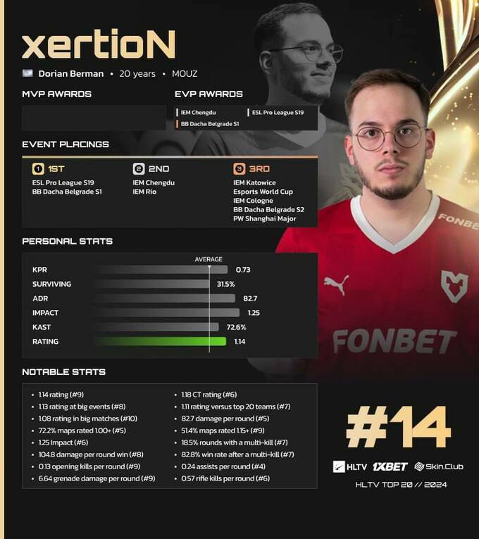 Доріан «xertioN» Берман дебютирует на 14-м месте в рейтинге лучших игроков года по версии HLTV, благодаря отличной стабильной игре на протяжении года и тому, что он был лучшим игроком в двух триумфальных кампаниях своей команды.