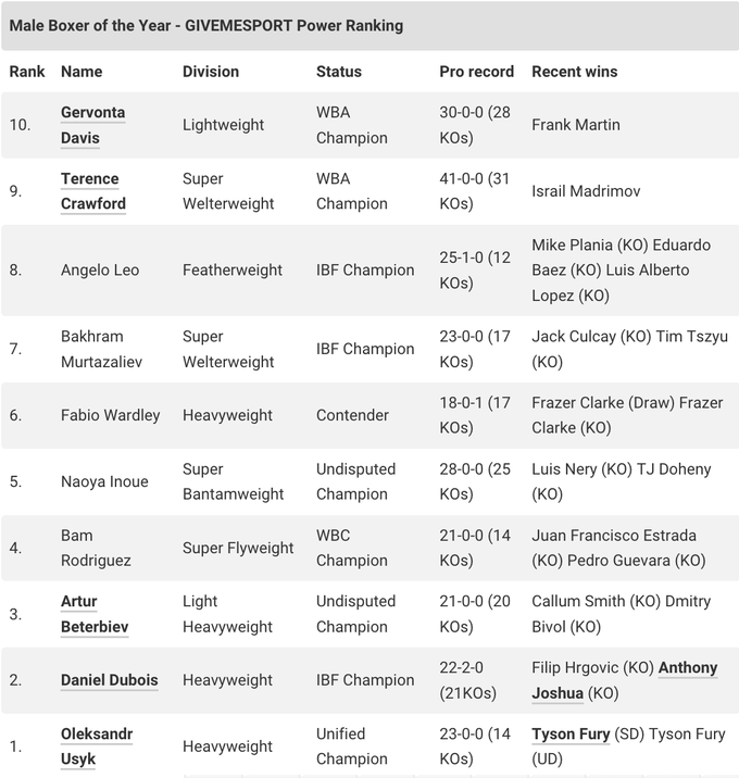 В окончательном рейтинге Александр Усик обогнал Даниэля Дюбуа, который был ранее лидером списка. Усик в 2024 году провел два боя – дважды победил ранее непобежденного Тайсона Фьюри. Дюбуа в 2024 году победил Филипа Хрговича и в поединке за звание чемпиона мира по версии IBF деклассировал Энтони Джошуа.