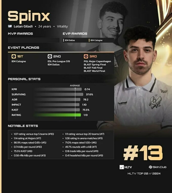 Лотан «Spinx» Гилади в третий раз подряд попал в список лучших игроков года по версии HLTV. Его стабильность в течение сезона обеспечила ему 13-е место в рейтинге.