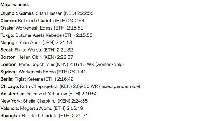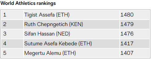- Благодаря победе в Берлине и олимпийскому серебру Тигист Ассефа возглавила мировой рейтинг с результатом 1480 баллов, лишь на один балл опередив Чепнгетич, а Хассан заняла третье место, лишь на три балла отстав от Чепнгетич. В этом году 10 лучших женщин преодолели марафон менее, чем за 2:17.