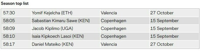 - В Валенсии было показано пять из 10 лучших результатов сезона, в Копенгагене – три, а в Праге и Рас-эль-Хайме – по одному. В этом году десять мужчин преодолели дистанцию меньше, чем за 59 минут.