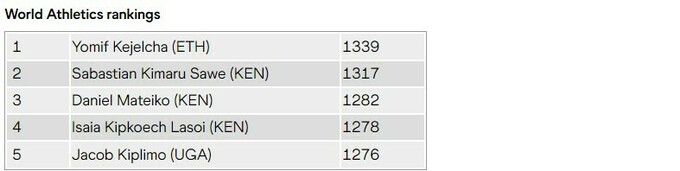 - Еще одним выдающимся выступлением стало выступление чемпиона мира по полумарафону Сабастиана Соу, который опередил Якоба Киплимо и выиграл Копенгагенский полумарафон с результатом 58:05, что ставит его на девятое место в мировом рейтинге за всю историю. Киплимо показал время 58:09, а Кипкоеч показал личный рекорд – 58:10, что позволило ему занять второе место.