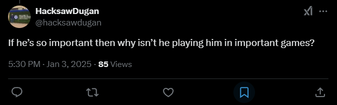 HacksawDugan: «Если он так важен, почему тогда тренер не ставит его в важные матчи?».