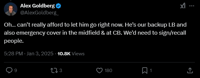 Alex Goldberg: «Ох... сейчас они не могут позволить себе его отпустить. Он у них запасной центральный защитник и также экстренное прикрытие в полузащите и на позиции центрального защитника. Нам нужно будет подписывать новых игроков или возвращать тех, кто был в аренде».