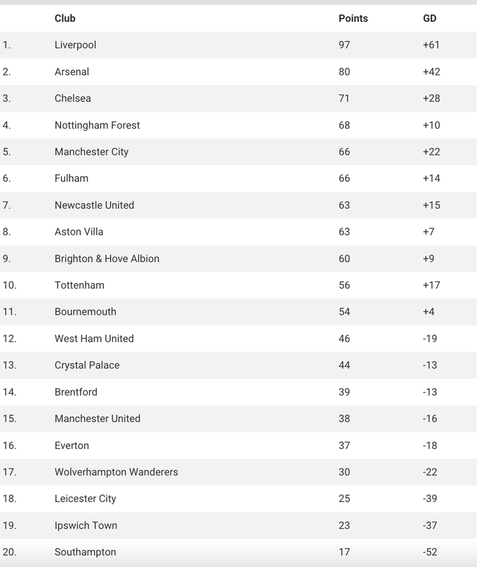 Суперкомпьютер от известного британского издания GiveMeSport спрогнозировал итоговую турнирную таблицу Английской Премьер-лиги 2024/25.