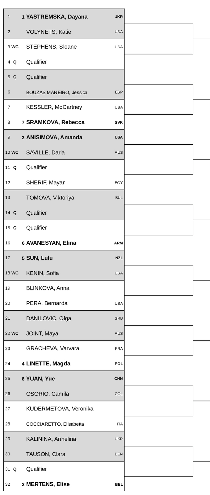 Ястремская получила первый номер посева и в 1/16 финала встретится с Кэти Волынец (США, WTA 58). Во 2-м раунде у Даяны возможна либо Слоан Стивенс (США, WTA 74), либо теннисистка из квалификации.