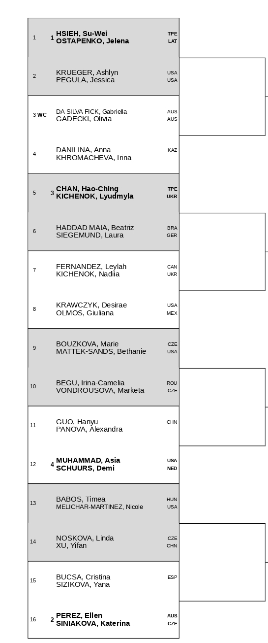 Людмила в одном тандеме с Чжань Хаоцин (Тайвань) получила третий номер посева и в 1-м раунде сыграет против пары Лаура Зигемунд (Германия) / Беатрис Хаддад Майя. Это будет второй турнир для Киченок и Чжань в одном дуэте. В Брисбене они дошли до 2-го круга, где проиграли Анне Калинской и Присцилле Хон.