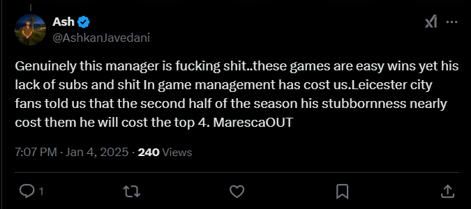 Ash: «Честно говоря, этот тренер просто ужасный... эти игры легко выигрывать, но его отсутствие замен и ужасное управление игрой стоят нам побед. Болельщики «Лестера» говорили, что во второй половине сезона его упрямство чуть не стоило им всего, он лишит нас топ-4. Мареска, уходи».