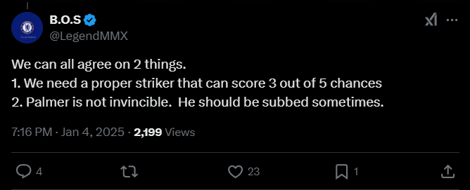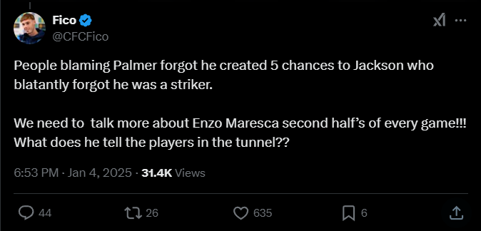 Fico: «Люди, которые винят Палмера, забыли, что он создал 5 голевых моментов для Джексона, который явно забыл, что он нападающий. Нам нужно больше говорить о второй половине игры при Энцо Мареске! Что он говорит игрокам в раздевалке?».