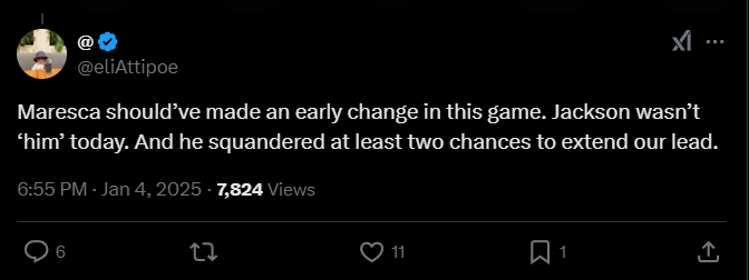 EliAttipoe: «Мареска должен был сделать раннюю замену в этой игре. Джексон сегодня был не тот. И он упустил по крайней мере два шанса, чтобы увеличить наше преимущество».