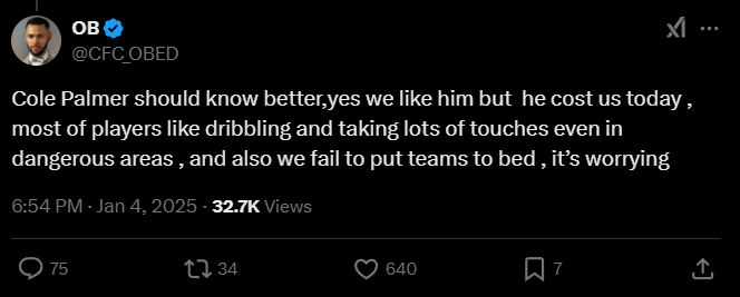 OB: «Коул Палмер должен был знать лучше, да, мы его любим, но он стоил нам победы сегодня. Большинство игроков любят дриблинг и делают много касаний, даже в опасных зонах, а также мы не можем доводить команды до конца, не забиваем, когда надо. Это настораживает».