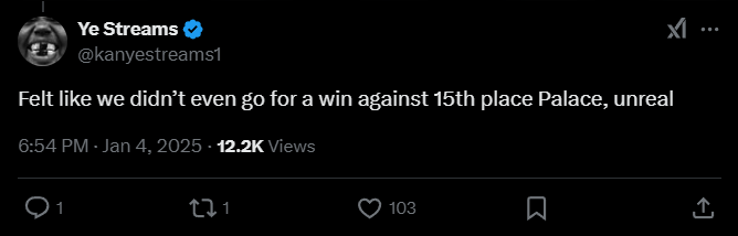 Ye Streams: «Сложилось ощущение, что мы даже не пытались выиграть против «Кристал Пэлас», который занимает 15-е место, нереально».