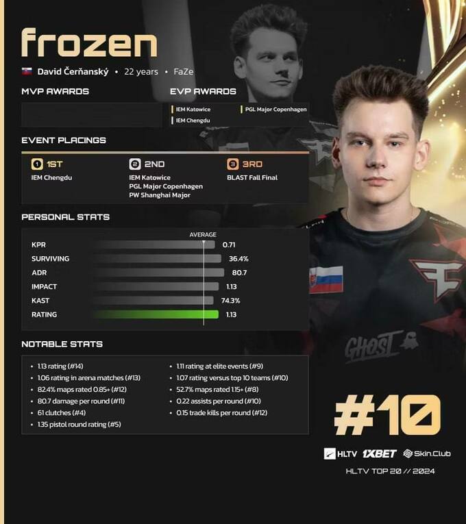 22-летний Давид «frozen» Чернянский продемонстрировал свой талант в полной мере во время первого полного сезона в составе FaZe Clan, заняв 10-е место после 17-го в 2022 году и 12-го в 2023-м.