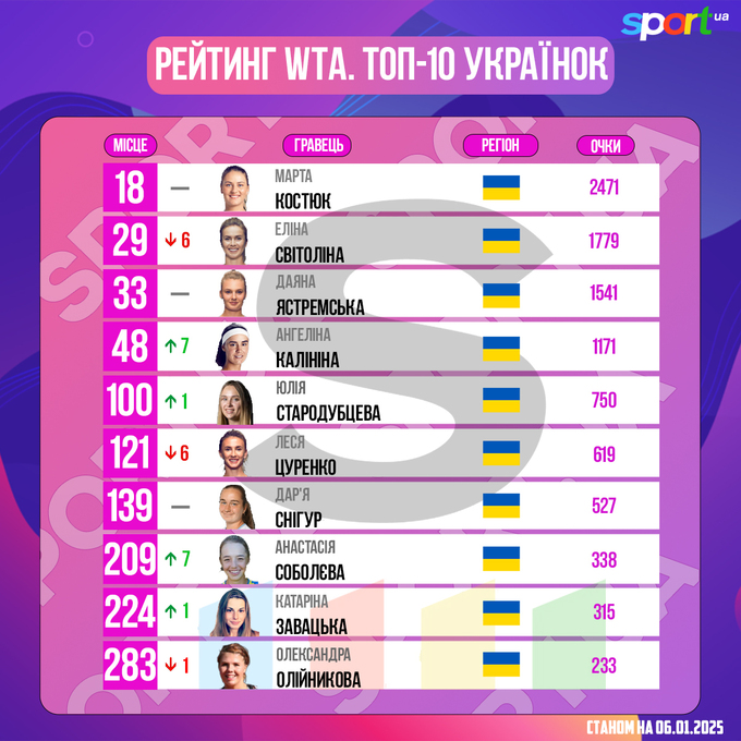 В топ-10 изменений нет, Марта Костюк и Даяна Ястремская сохранили свои места