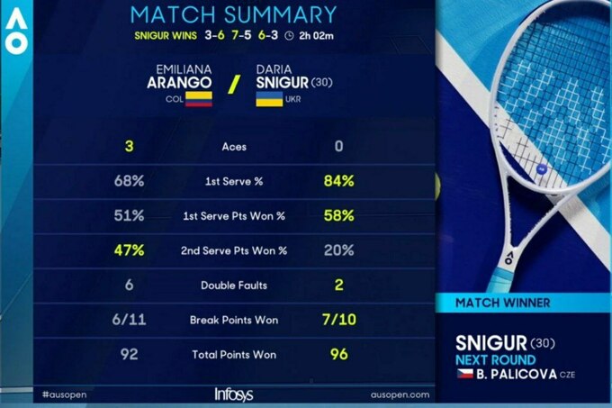 Дарья Снигур (Украина) [30] – Эмилиана Аранго (Колумбия) – 3:6, 7:5, 6:3