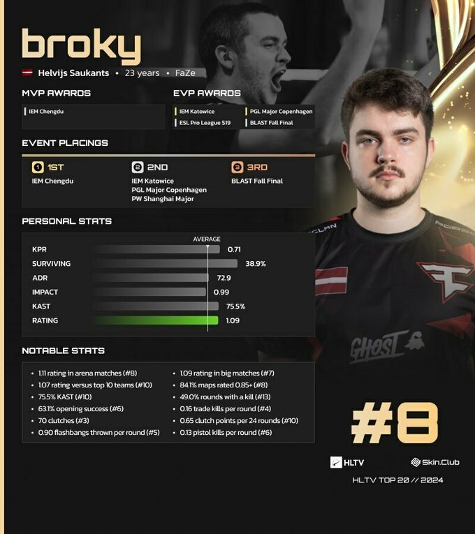 В первой половине года broky впечатлял стабильностью, достигнув невероятных высот с FaZe, которые вышли в восемь финалов турниров после релиза CS2. Однако во второй половине сезона его форма снизилась, что повлияло на итоговый рейтинг.