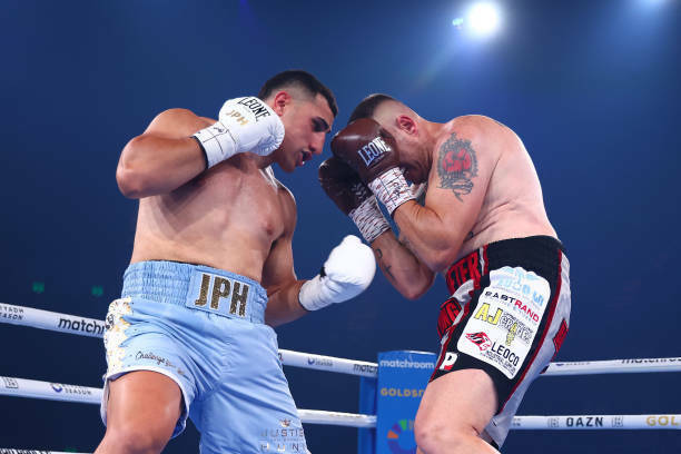 Во втором раунде Джастис опасно попал правым хуком, добавил апперкот и принялся добивать соперника – рефери решил не ждать и остановил бой. ТКО 2. Хуни защитил титулы IBF Pan Pacific и WBO Global.
