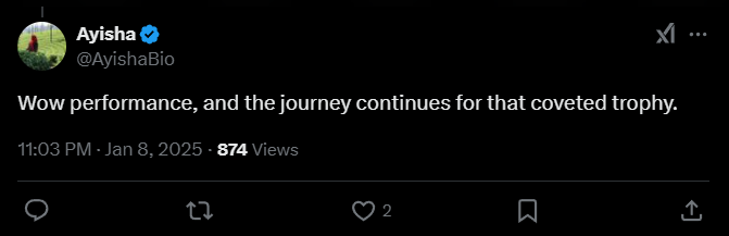 Ayisha: «Удивительное выступление! Путешествие к заветному трофею продолжается».