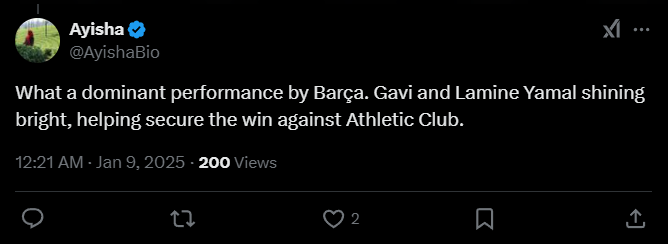 Ayisha: «Какое доминирующее выступление «Барсы». Гави и Ламин Ямал блистали, помогая обеспечить победу над «Атлетиком».
