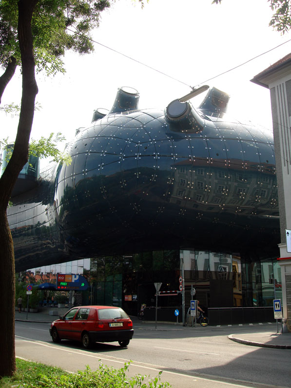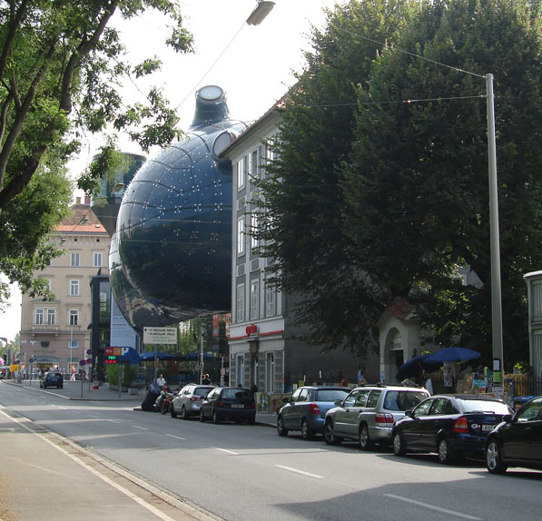 О достопримечательностях Граца можно писать объемный трактат, но лучше, конечно, скажут фотографии. Из общей архитектуры выбивается местный музей современного искусства – Кунстхаус. Из какого-то КосмоЗоо в этот старинный городок (прямо в центре) приземлился огромный «слонопотам». На мой, не искусствоведческий, взгляд вписался в окружающее пространство он очень славно и действительно разнообразит картину. Внутри же… тоже интересно, но, конечно, современное искусство пока еще не достигло силы предшествующих эпох. Фотографировать, в принципе, не разрешали интеллигентные смотрительницы (может, вам и лучше), но понравилась композиция «раздолбаный вдребезги стул» (видимо, под воздействием «потного вала вдохновения»), хороши были и надувные теремы (знаете, в таких могут попрыгать детишки), занимающие один из залов в полумраке – на них проецировались различные изображения и все это было оригинально. Впрочем, залезть внутрь и попрыгать нам не разрешили. Может, потому что мы зацепили один из расположенных на полу магических шаров – смотритель долго устанавливал его на положенном месте.
