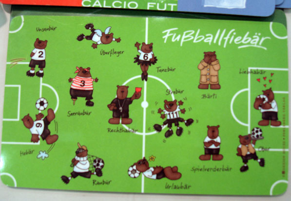Коврик для мыши и интересная трактовка футбольных амплуа. Левый бек спит, правому хаву вообще раскроили череп. Либеро - австрийский официант, у опорника много ног (удобно делать подкаты), зато медведь под нападающими уже пострадал от защитников. Но, конечно, круче всех правый нападающий.