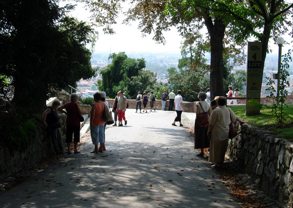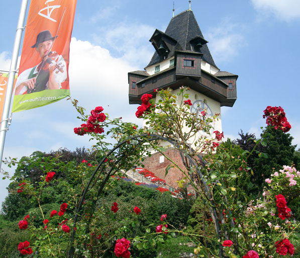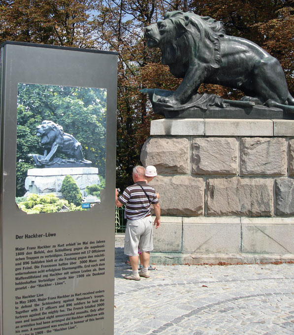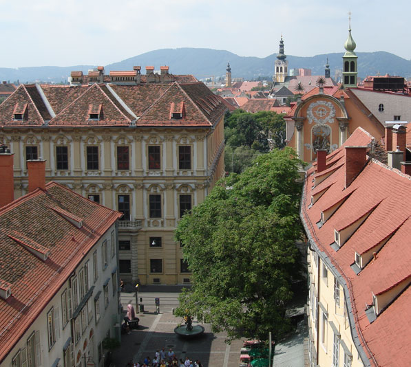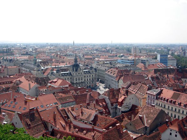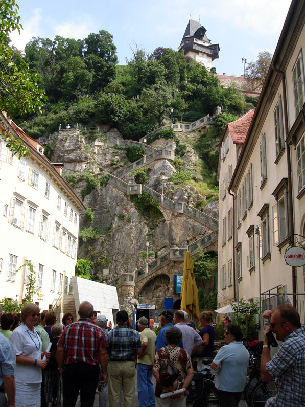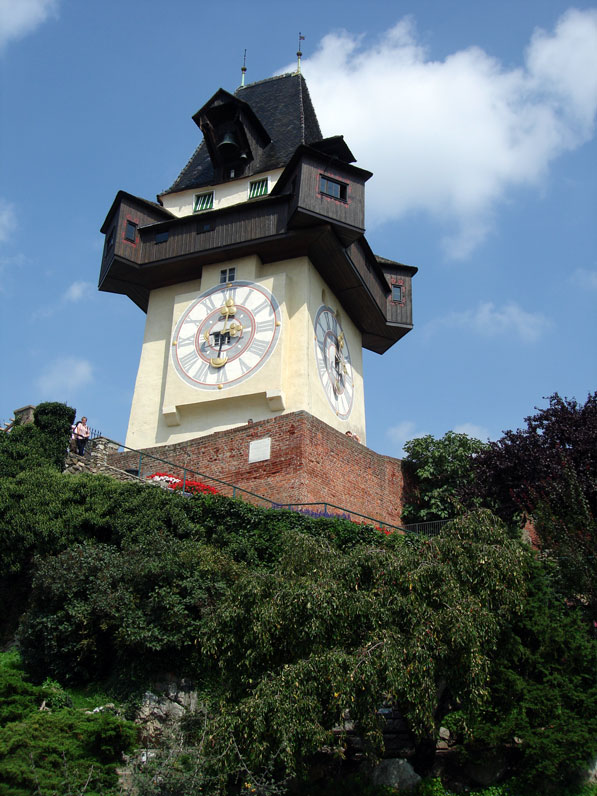 Одна из главных достопримечательностей – это Шлоссберг, крепость на горе. 473 метра вверх по ступенькам и с каждым пролетом вид становится все лучше. Когда-то этим видом наслаждались и солдаты Наполеона, с матом взбираясь наверх (без ступенек, фуникулера и в стеклянный лифт внутри горы их тоже, конечно, не пускали). Французы так и не смогли покорить Шлоссберг, который защищала небольшая группа солдат во главе с майором Францем фон Хаккером. Этому человеку поставили памятник в виде льва (его изображение не сохранилось). Но подвиг оказался практически напрасным, ибо Вена была захвачена и пришлось капитулировать и Грацу. Раздосадованные французы почти все укрепления на горе снесли, кроме часовой башни и колокольни. Чтоб их не сносили, горожане заплатили французам деньги и те, поразмыслив, согласились. Как видите, за свои памятники архитектуры жители Граца готовы были идти на жертвы даже в те далекие времена. Поэтому в наши спокойные времена можно не волноваться за исторический центр Граца.
