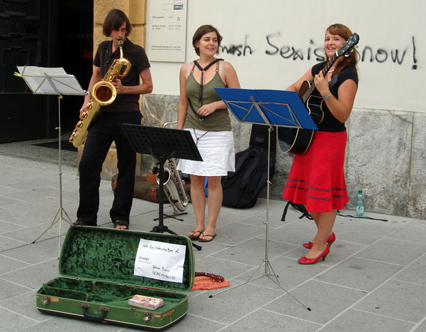 Похоже, гопничество в Австрии отсутствует, как вид, по крайней мере, около часа ночи по улицам разъезжают на великах маленькие девочки без сопровождения, и даже на привокзальной площади (у нас такие места всегда вбирают в себя «нечистоты» города) все чисто, спокойно, аккуратно. Люди бродят по улицам, сидят в кафешках, пьют свое вкусное пиво, едят сосиски и наслаждаются красотой и ухоженностью своего города. Впрочем, это не потому что они лучше, чем мы (не бросают, к примеру, бумажки на мостовую или не царапают на стенах каббалистические знаки). У них правительство лучше… Поэтому, бумажки подбираются, надписи стираются, здания ремонтируются, зарплаты получаются, ну и т.д.
