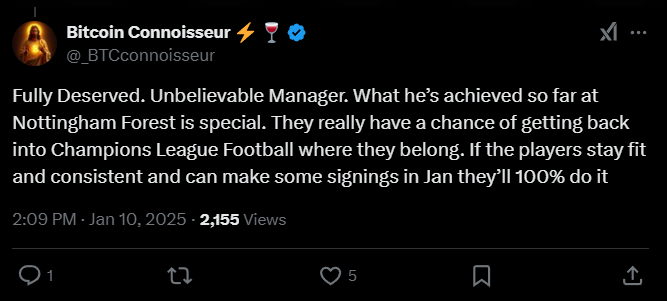 Bitcoin Connoisseur: «Полностью заслуженно. Невероятный тренер. То, что он уже достиг в «Ноттингем Форест», это нечто особенное. У них действительно есть шанс вернуться в Лигу чемпионов, туда, где они и должны быть. Если игроки останутся здоровыми и стабильными, и удастся сделать несколько подписаний в январе, они 100% справятся».