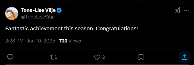Tone-Lise Vilje: «Фантастическое достижение в этом сезоне. Поздравляем!».