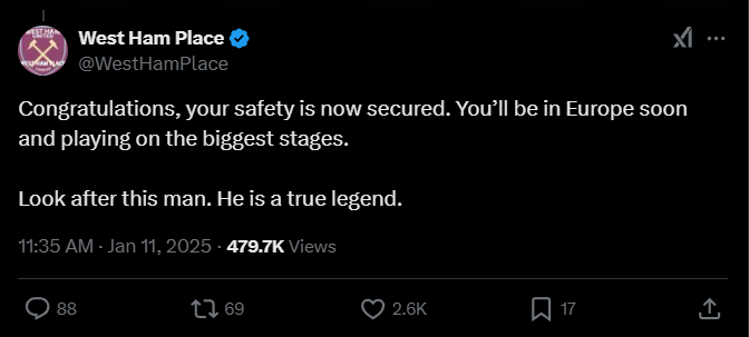 West Ham Place: «Поздравляю, теперь вы в безопасности. Скоро вы будете в Европе и будете играть на самых больших сценах. Берегите этого человека. Он настоящая легенда».