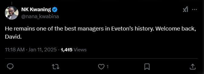 NK Kwaning: «Он остается одним из лучших менеджеров в истории «Эвертона». Добро пожаловать обратно, Дэвид».