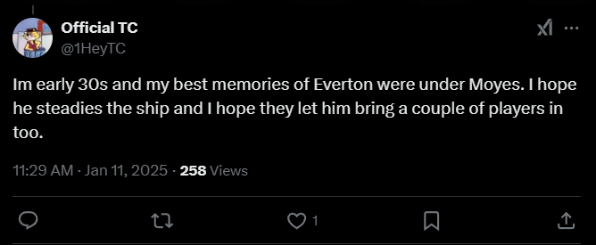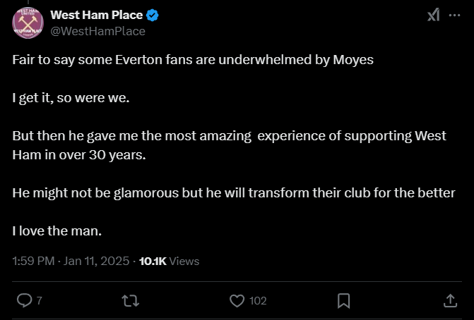 West Ham Place: «Честно говоря, некоторые фанаты «Эвертона» не в восторге от Мойеса. Я понимаю, мы тоже. Но потом он подарил мне самый потрясающий опыт поддержки «Вест Хэма» за последние 30 лет. Он, может, и не гламурный, но он изменит их клуб к лучшему. Я люблю этого человека».