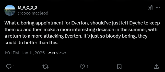 MAC 22: «Какое скучное назначение для «Эвертона», надо было просто оставить Дайча, чтобы он их поддерживал, а потом принять более интересное решение летом, вернувшись к более атакующему «Эвертону». Это просто чертовски скучно, они могли бы сделать лучше».