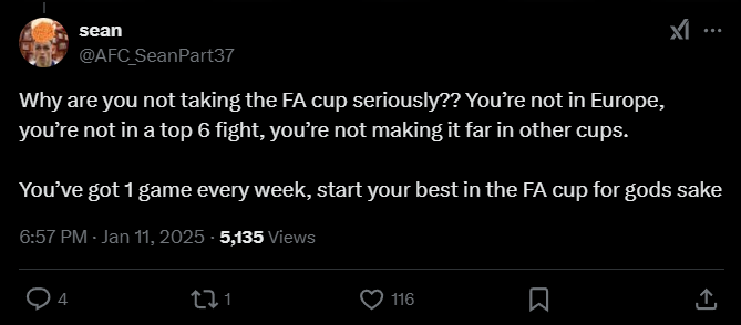 Sean: «Почему вы не воспринимаете Кубок Англии всерьез?? Вы не в Европе, не в топ-6, не продвигаетесь далеко в других кубках. У вас 1 игра в неделю, начните с лучшего состава в Кубке Англии, ради бога!».
