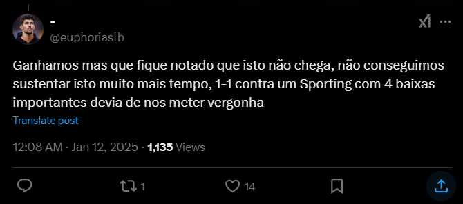 Euphoriaslb: «Мы выиграли, но стоит отметить, что этого недостаточно, мы не сможем удерживать такой уровень долго. Ничья 1:1 против «Спортинга», у которого было 4 ключевых игрока, должна нас позорить».