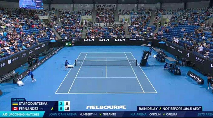 В воскресенье украинка в 02:00 вышла на корт Kia Arena против Лейлы Фернандес (Канада, WTA 31). После восьми геймов в первом сете игра была прервана при счете 5:3 в пользу Фернандес на подаче из-за дождей в Мельбурне.