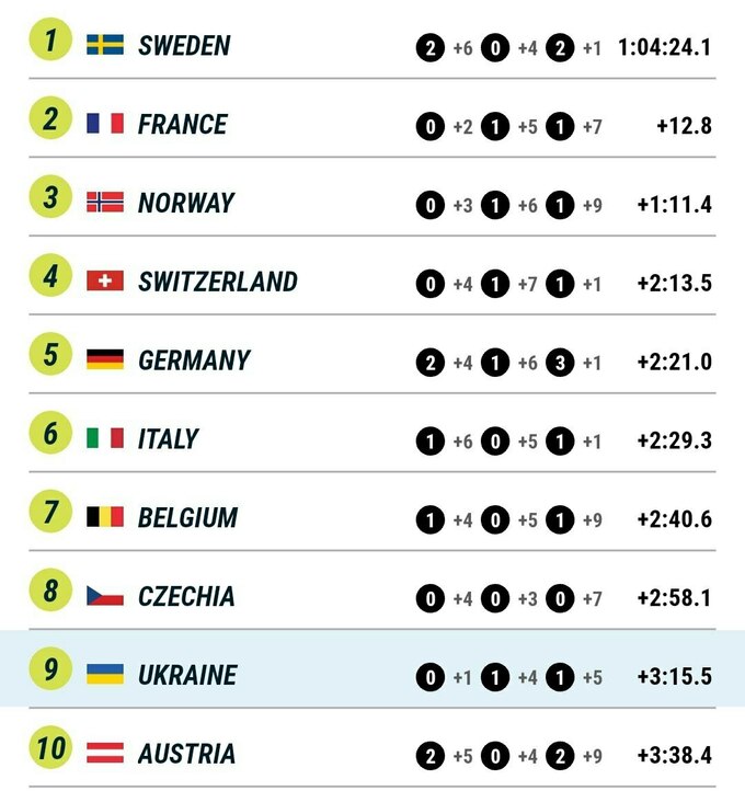 Сборная Швеции торжествовала в смешанной эстафете, имея в активе два штрафных круга и использовав 10 дополнительных патронов. После последнего огневого рубежа шведка, Эльвира Эберг, принесла команде победу, обогнав на трассе француженку Лу Жанмонно. В итоге Франция – вторая, а вот тройку замкнула Норвегия.