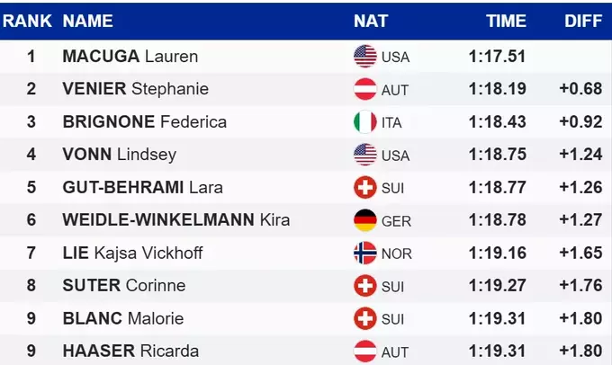 Американка Лорен Масуга финишировала первой, закончив супергигант с общим временем 1:17.51. Вторую строчку заняла представительница Австрии Стефани Венир, проигравшая лидеру 0.68 секунд. В топ-3 также попала триумфатор предыдущего соревнования Федерика Бриньоне.