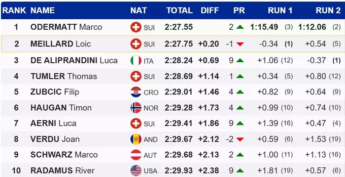 Победителем слалома, с общим временем 1:12.06, стал швейцарец Марко Одерматт, который на 0.2 секунды опередил своего партнера по сборной Лоика Мейяра. Третьим финишировал итальянец Лука Де Адипрандини, которому после второй попытки удалось подняться на девять позиций.