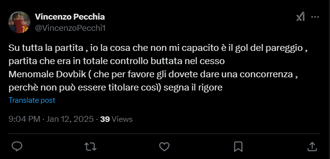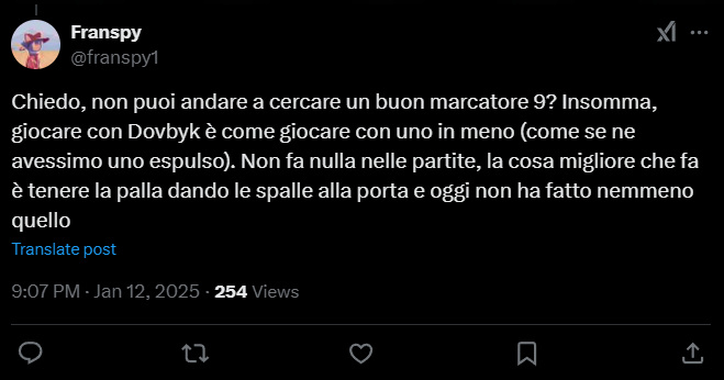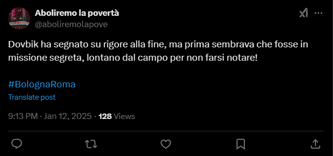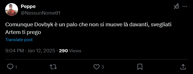 John_E57: «Этот Довбик, вместо того чтобы отдать пас на партнера, который входил в штрафную, сильно ударил по мячу, и в результате рикошета «Рома» потеряла баланс в атаке, что привело к голу в ничью от «Болоньи». Вот такая суть».