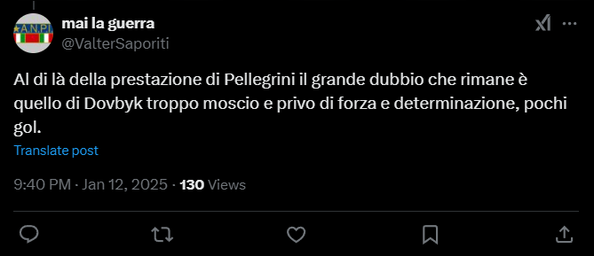 Mai la guerra: «Помимо игры Пеллегрини, главный вопрос это Довбик, слишком вялый, без силы и решимости, мало голов».