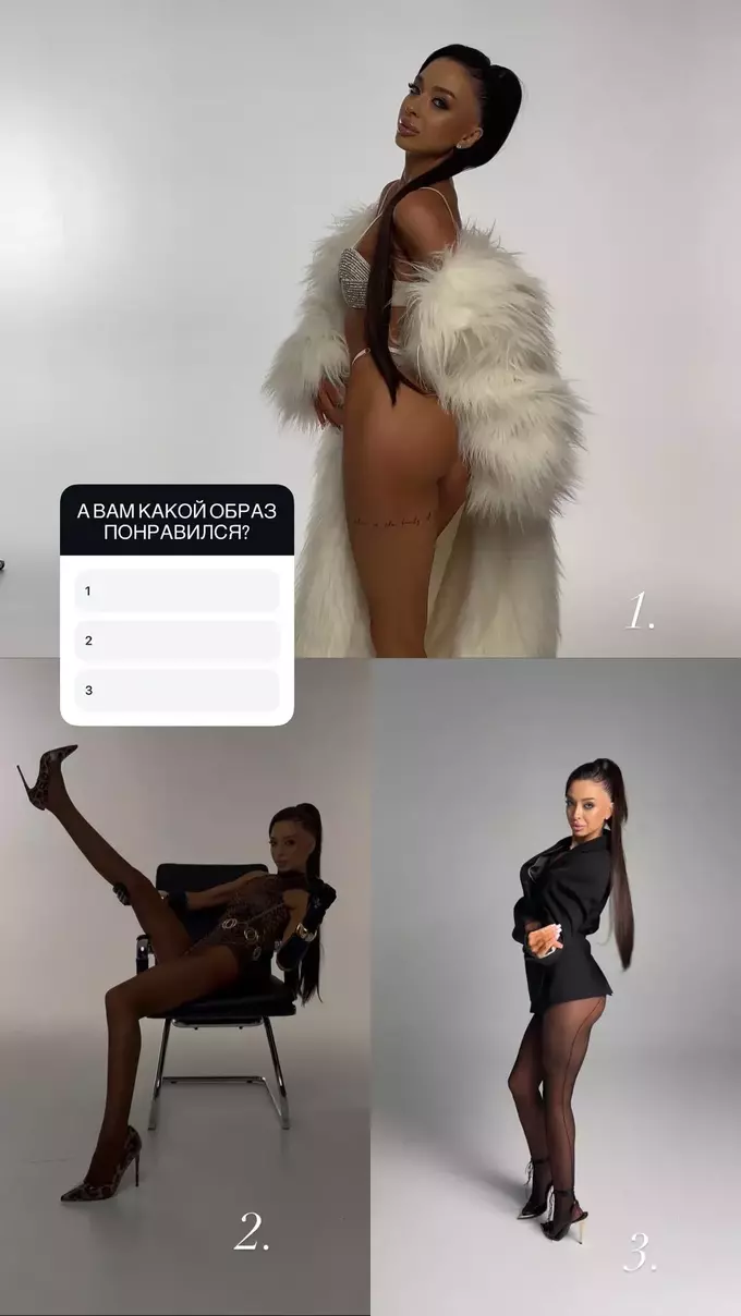 На одной из фотографий красавица стоит ягодицами к камере и позирует в нижнем белье и шубе, а на другом снимке провокационно поднимает вверх одну ногу, сидя на кресле.