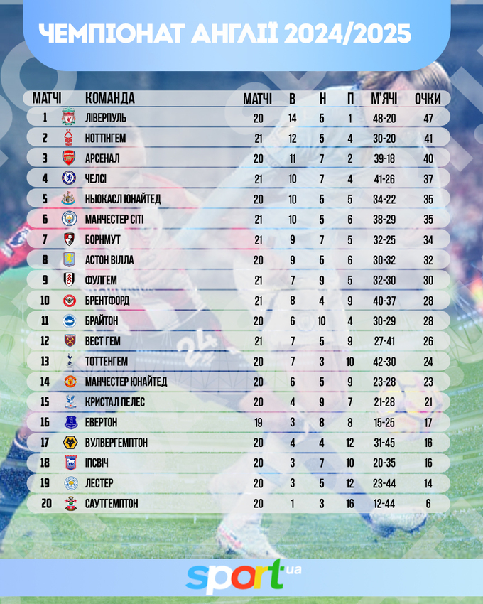 Лидеры АПЛ: Ливерпуль (47 очков), Ноттингем Форест (41), Арсенал (40), Челси (37), Ньюкасл, Ман Сити (по 35).