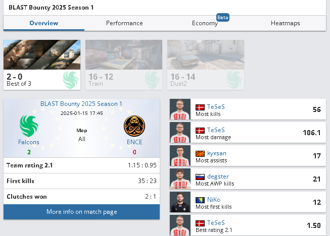 Сегодня, 15 января, состоялся матч между ENCE и Falcons на первом турнире 2025 года BLAST Bounty. Игра завершилась со счетом 2:0 в пользу саудовского клуба на картах Train (16:12) и Dust 2 (16:14).